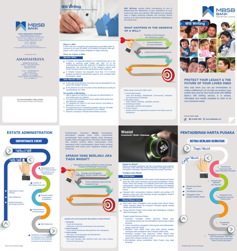 41 Upon receipt of the original Will or Wasiat from MTB you shall. In the absence of a Will the whole of your estate will be distributed according to Faraid or family arrangement. AmanahRaya provides Will Services for both Muslims and Non-Muslims.