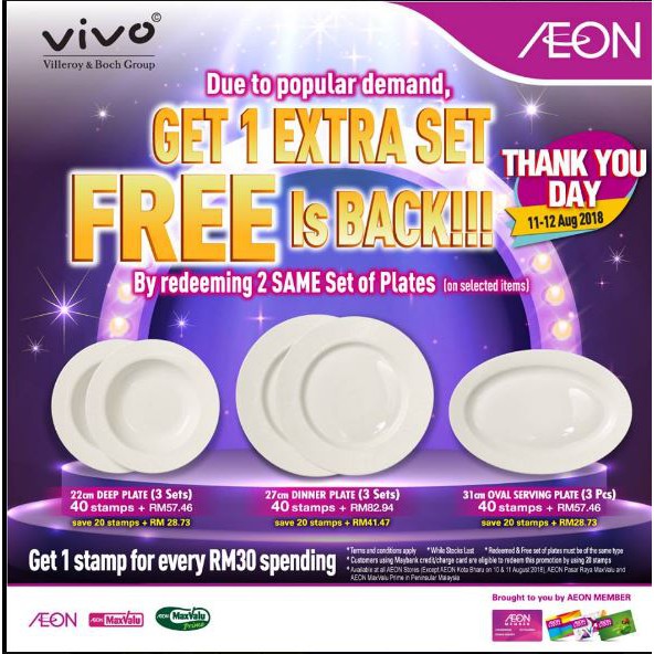 COPYRIGHT AEON CO. Dont miss this opportunity to redeem 2 same sets of 22cm Deep Plate 27cm Dinner Plate 31cm Oval Serving Plate and get 1 EXTRA FREE set of the same item. Aeon Easy PaymentProduction house.